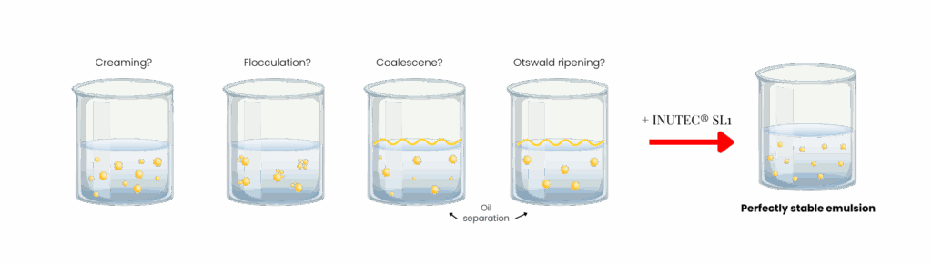Derived from chicory root inulin, grafted with a lauryl chain, INUTEC® SL1 has a unique amphiphilic structure that behaves differently at the oil–water interface. Instead of thickening the system, it wraps each oil droplet in a hydrated protective layer. This steric barrier keeps the emulsion stable, even in the presence of salts, preservatives, or high UV filter loads. At the same time, viscosity stays low enough for smooth, even atomization through a spray pump. No separation. No clogging. No glue-like feel.